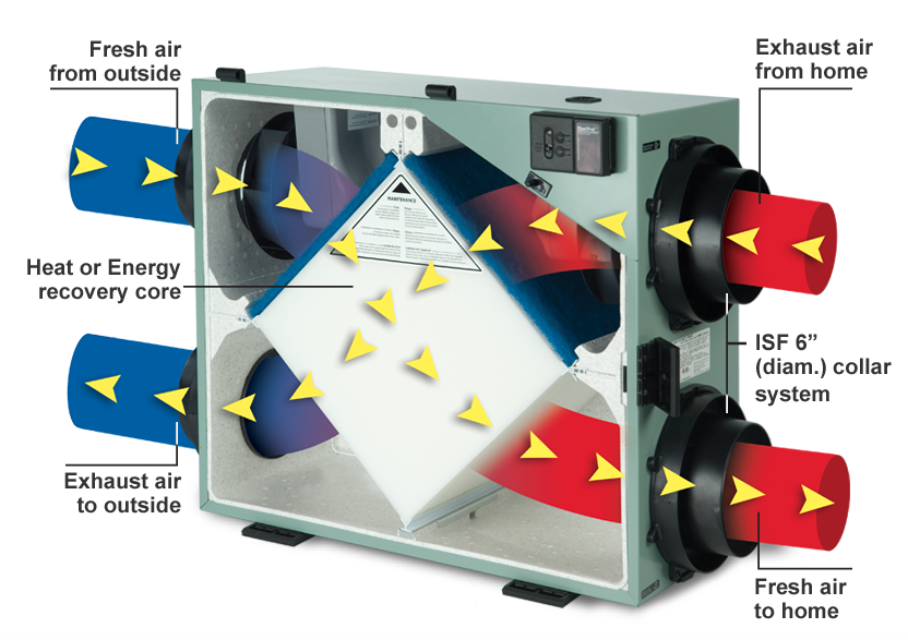 L'air contaminé et l'air frais de l’extérieur circulent par le noyau de récupération de la chaleur en empruntant des voies distinctes qui empêchent la contamination de l'air ou son mélange. L'air frais absorbe de la chaleur, se réchauffe et est ensuite poussé à une température plus confortable dans les différentes pièces de la maison par le système de ventilation
